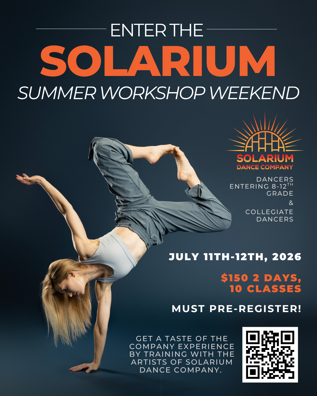 Get an in-depth look at the company experience this summer by dancing with Solarium Dance Company at the ENTER THE SOLARIUM | Summer Pre-Pro Workshop. Workshop will will consist of 5 classes per day in contemporary, ballet, jazz, hip hop, improvisation, choreographic process, and more from the director and company artists of Solarium Dance Company.